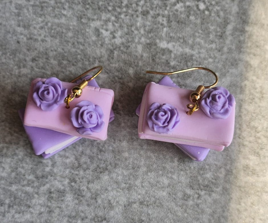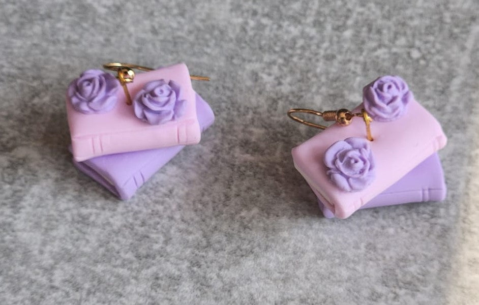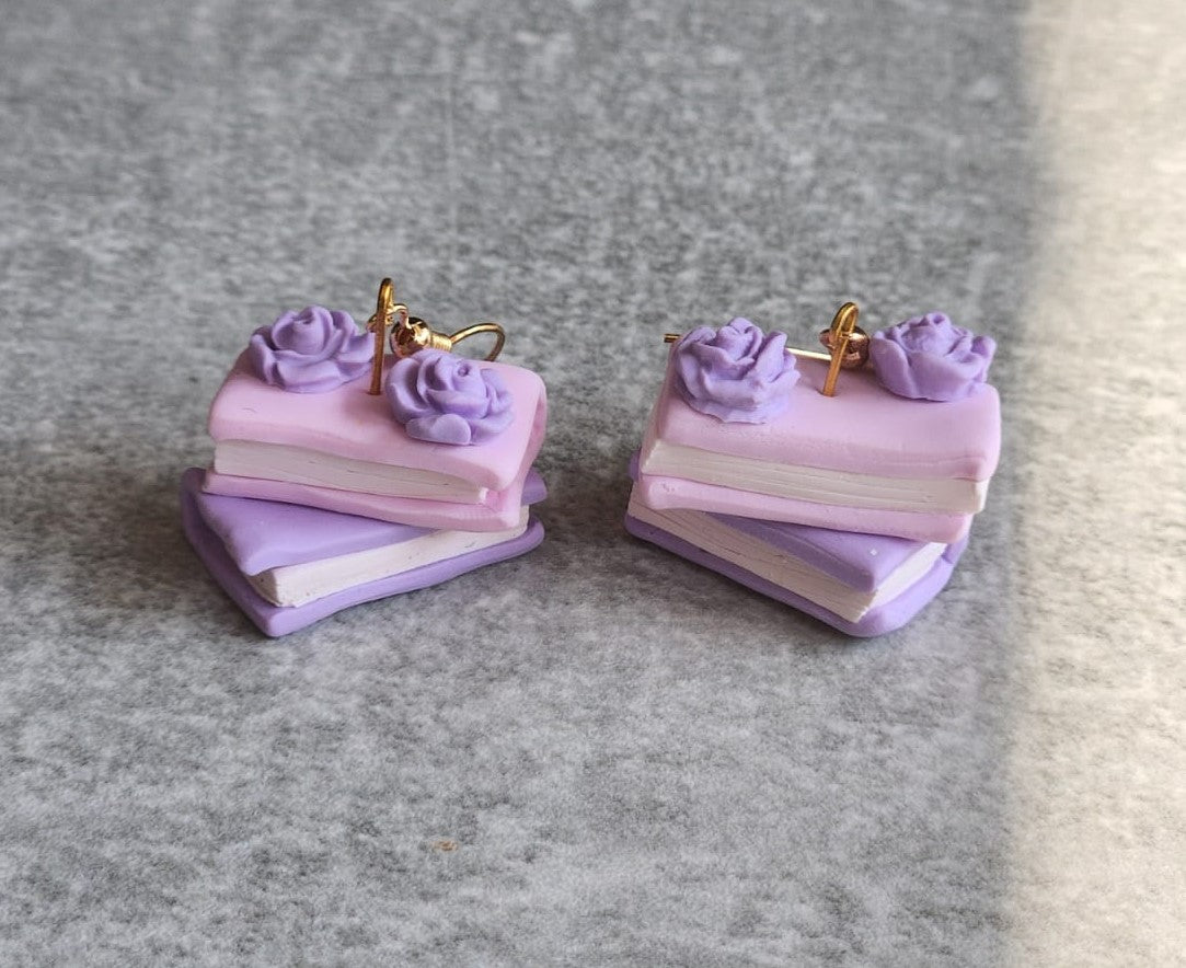 These whimsical earrings feature a playful and unique design crafted from polymer clay. Each earring showcases a stack of Two miniature books in shades of light purple and pink. On top of each book stack, there is a small, delicately crafted rose in a matching purple hue. The combination of the book stacks and roses creates a charming, literary-inspired look. The earrings are fitted with gold plated fishhook ear wires, adding a touch of elegance to the fun and creative design. these earrings are perfect for book lovers and those who appreciate distinctive.